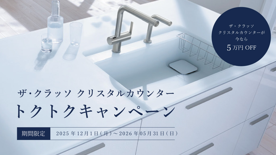 いつもリフォーム総本舗をご利用いただき、ありがとうございます。TOTOの大人気キッチン「ザ・クラッソ」のお得なキャンペーンが始まりました。汚れがついてもシミになりにくく、お手入れしやすい「クリスタルカ…