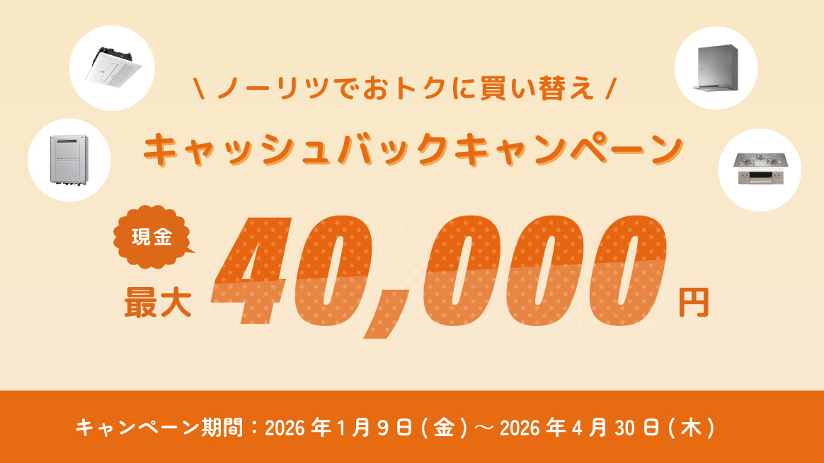 いつもリフォーム総本舗をご利用いただきまして、誠にありがとうございます。ノーリツのキャッシュバックキャンペーンのお知らせです!キャンペーン期間中にノーリツの対象商品(給湯機器、浴室暖房乾燥機、厨房機器…
