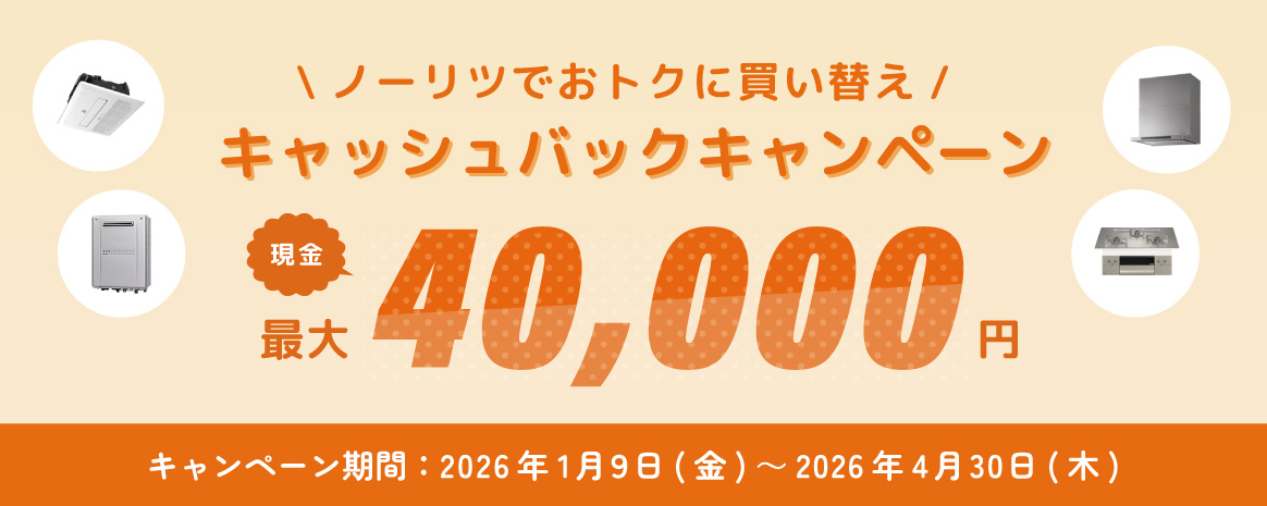 ノーリツのキャッシュバックキャンペーンのお知らせです!キャンペーン期間中にノーリツの対象商品(給湯機器、浴室暖房乾燥機、厨房機器)をご購入・設置・アプリ接続で、現金最大40,000円がキャッシュバックされます!