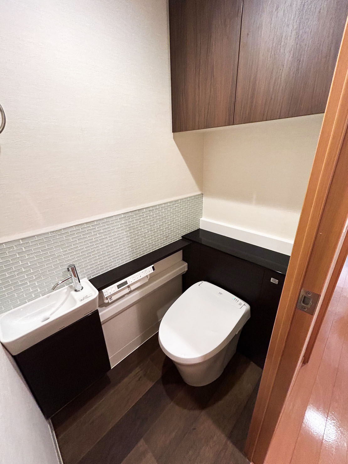 トイレをキャビネット付き便器、LIXILのリフォレにお取替え。手洗いをL型に設置し、同じスペース内で使い勝手を向上させました。収納スペースを増やし、すっきりとスタイリッシュな印象のトイレに生まれ変わりました。壁紙、床タイル、吊り戸も交換し、トイレの雰囲気をガラリと変えるリフォームとなっています。