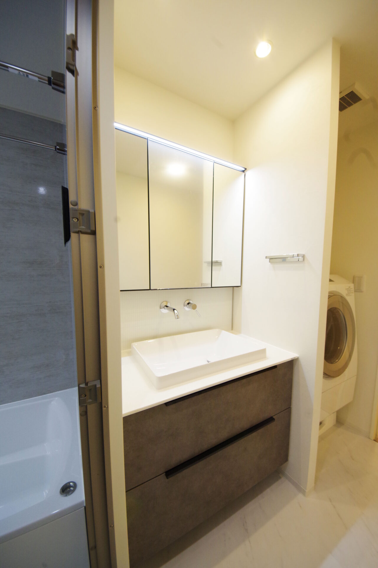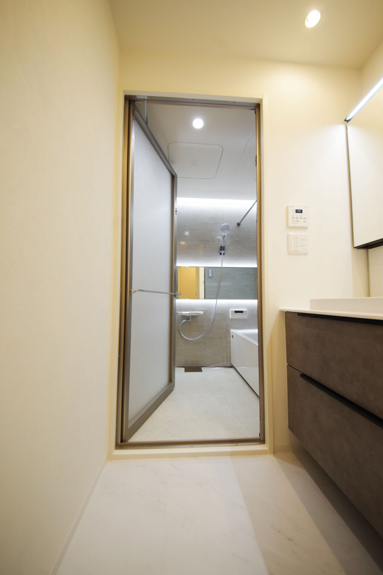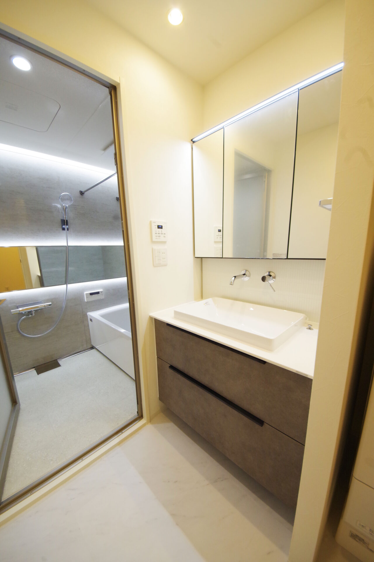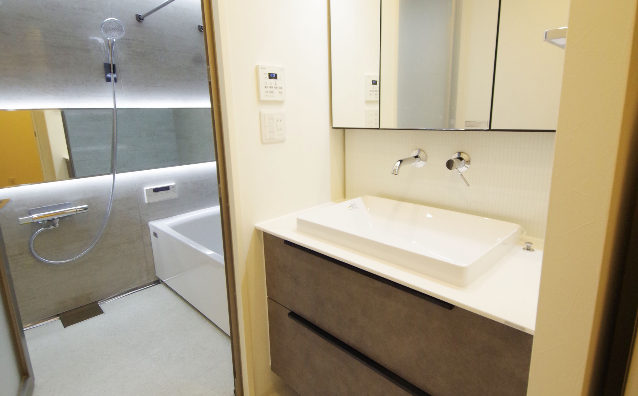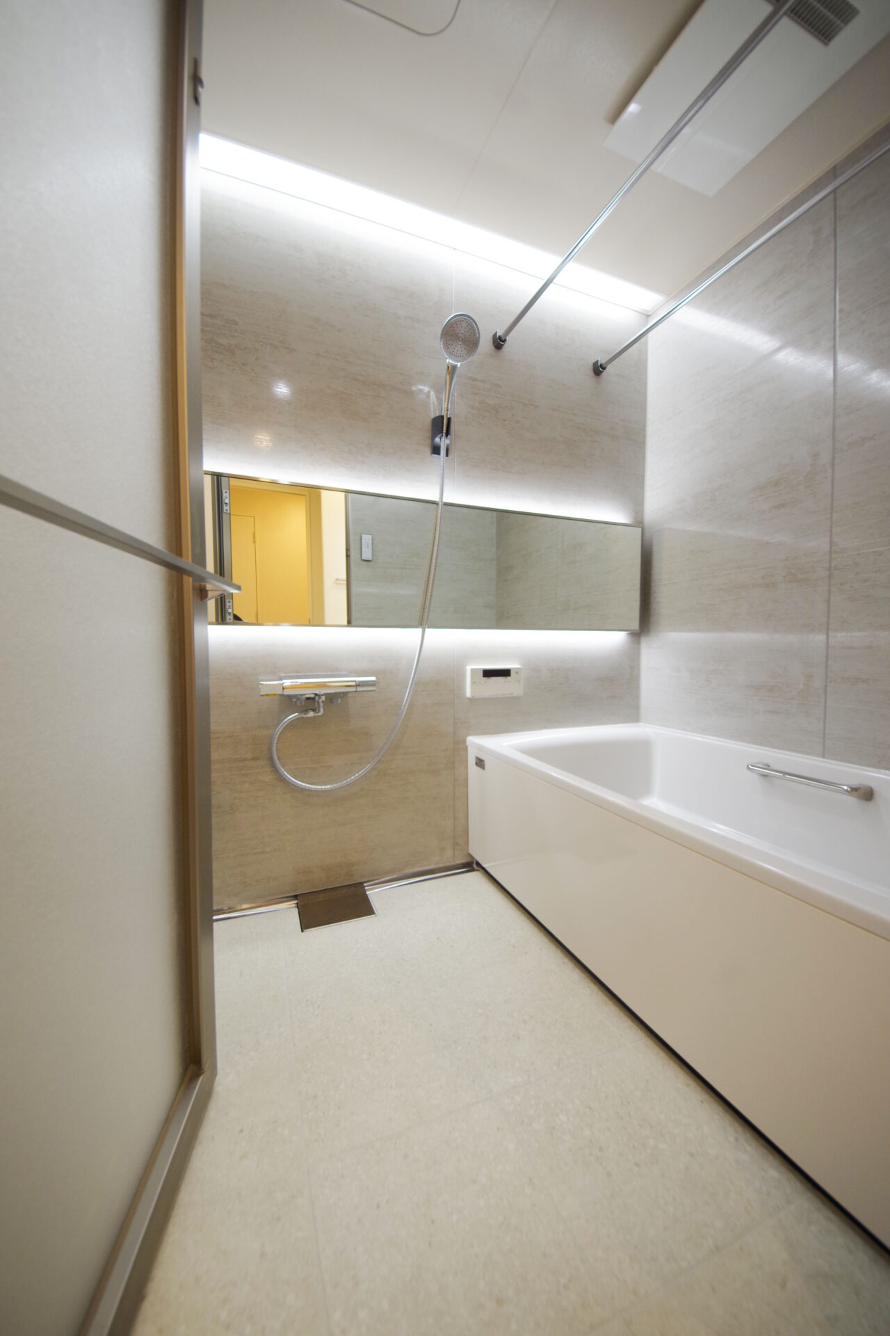 マンションのバスルームと洗面台を交換しました。ミラー下からやわらかく広がる照明は、気分に合わせて光の色を変えられます。ワンランク上の空間が、毎日の入浴時間をよりくつろぎのひとときへと変えてくれます。