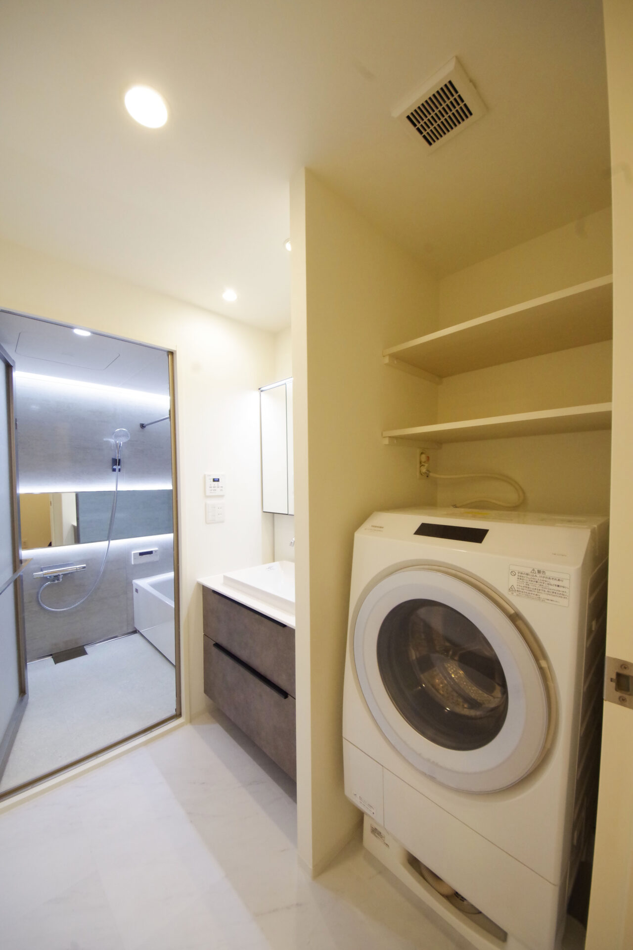 - 洗濯機の上に新たに収納を設置しました。以前はラックを置いていましたが、より安定感のある収納へと変更しました。
