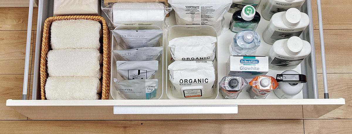 大型のストック品やドライヤー、ヘアアイロンなどもスッキリと収納でき、小物も使いやすい場所に収納できます。洗面空間がすっきりと整い、使い勝手がアップします。