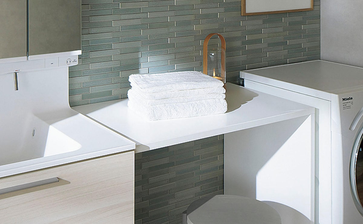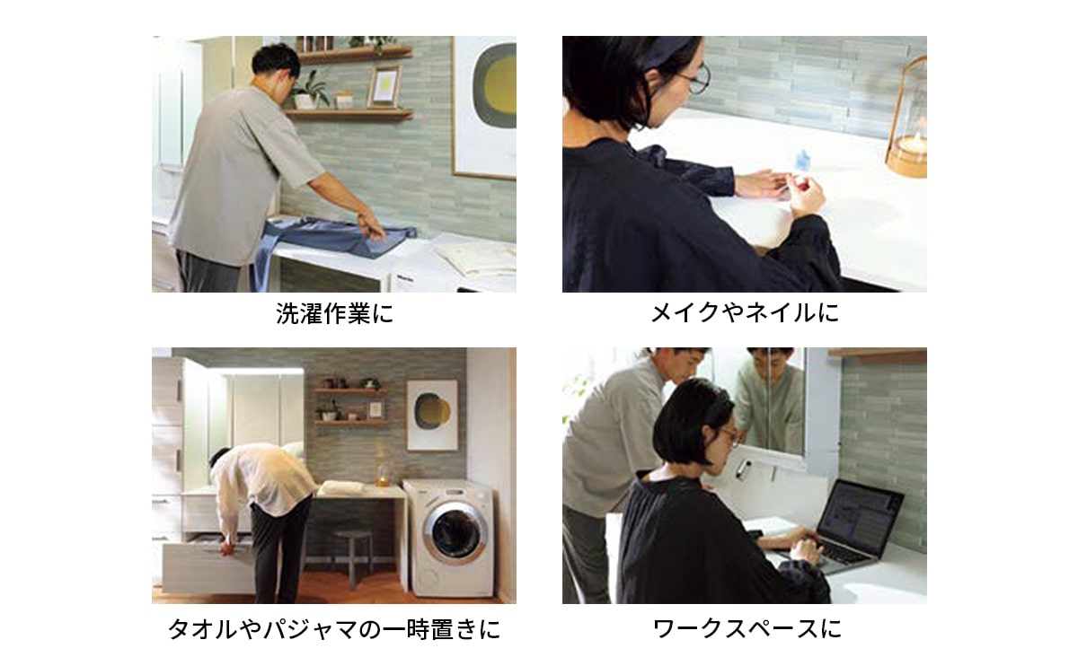 洗面台としてだけでなく、タオルやパジャマなどを置く収納スペースや、メイクや読書に最適な空間を提供します。ライフスタイルに合わせた自由な使い方ができます。