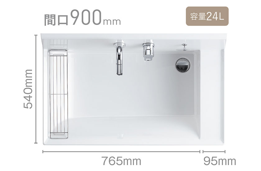底が広くて大容量の「ハイバックひろびろボウル」と、使いたい位置にくるりと回せる「くるくる水栓」ならバケツの水汲みや衣類のつけ置き洗いはもちろん、2人並んでの身支度もしやすいです。