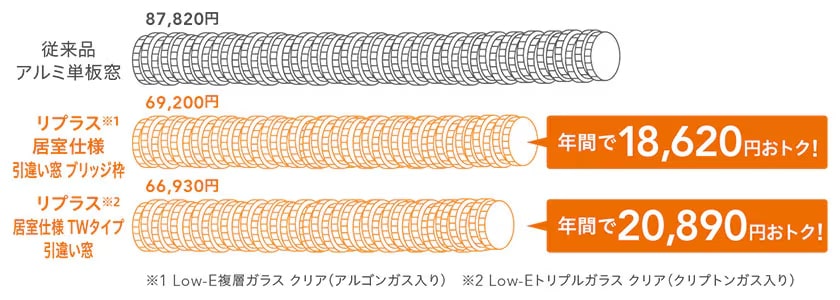 《省エネ効果算出条件》 ■熱負荷計算プログラム「AE-Sim/Heat」((株)建築環境ソリューションズ)を用いて算出した年間暖冷房負荷を、「平成25年省エネルギー基準に準拠した算定・判断の方法および解説Ⅱ住宅」((一財)建築環境・省エネルギー機構)に基づきエネルギー消費量、暖冷房金額に換算。 ■住宅モデル:2階建て/延べ床面積120.08m²/開口部面積32.2m² 「平成25年省エネルギー基準に準拠した算定・判断の方法および解説Ⅱ住宅」標準住戸のプラン ■想定家族:4人家族 ■想定暖冷房機器:エアコン、暖房:20℃/冷房:27℃・60% ■運転方法:間歇運転 ■計算地域:拡張アメダス気象データ2000年版(標準年) ■住宅断熱仕様:昭和55年省エネ基準適合レベル ■開口部仕様:居室の9窓をリプラスでリフォーム ■遮蔽物:居室の8窓にレースカーテン、和室に和障子を併用 ■ガラスの性能値は、JIS R3106、R3107に基づき求めた値を使用。 ■電気料金単価:31円/kWh(税込み) ※住宅の大きさや間取り、機器類、生活者人数、生活パターン、地域によって数値は異なります。目安としてご利用ください。