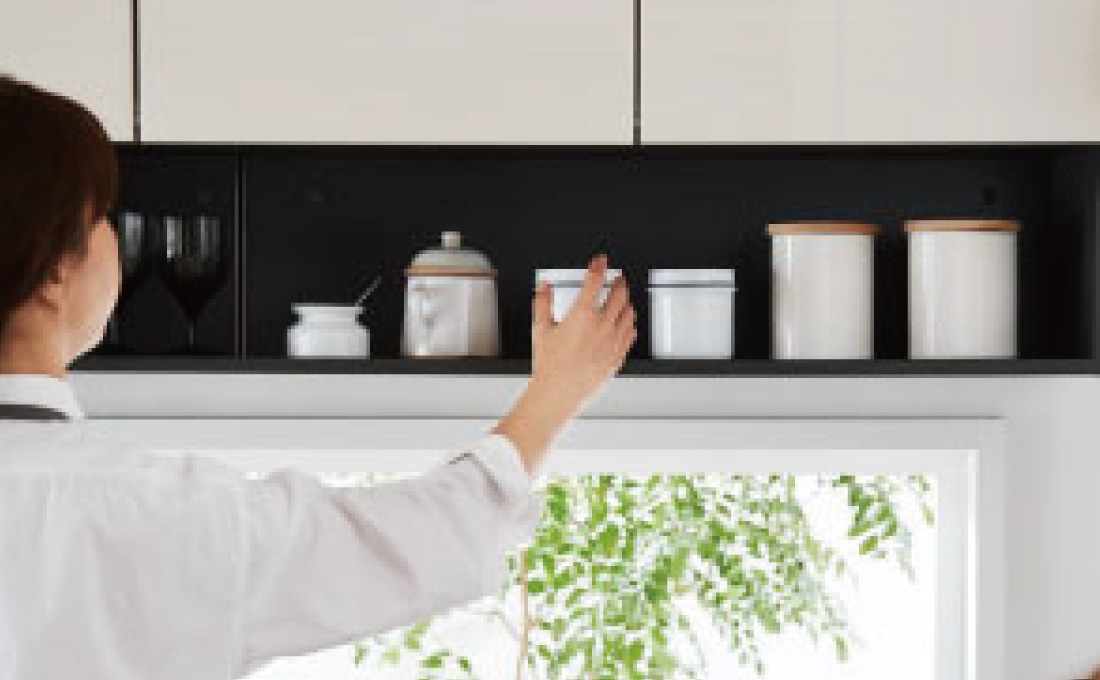 調理しながらすぐ手が届くオープンウォールを、ウォールキャビネット下に取り付けOK。よく使う食器や調味料だけでなく飾り棚にも。