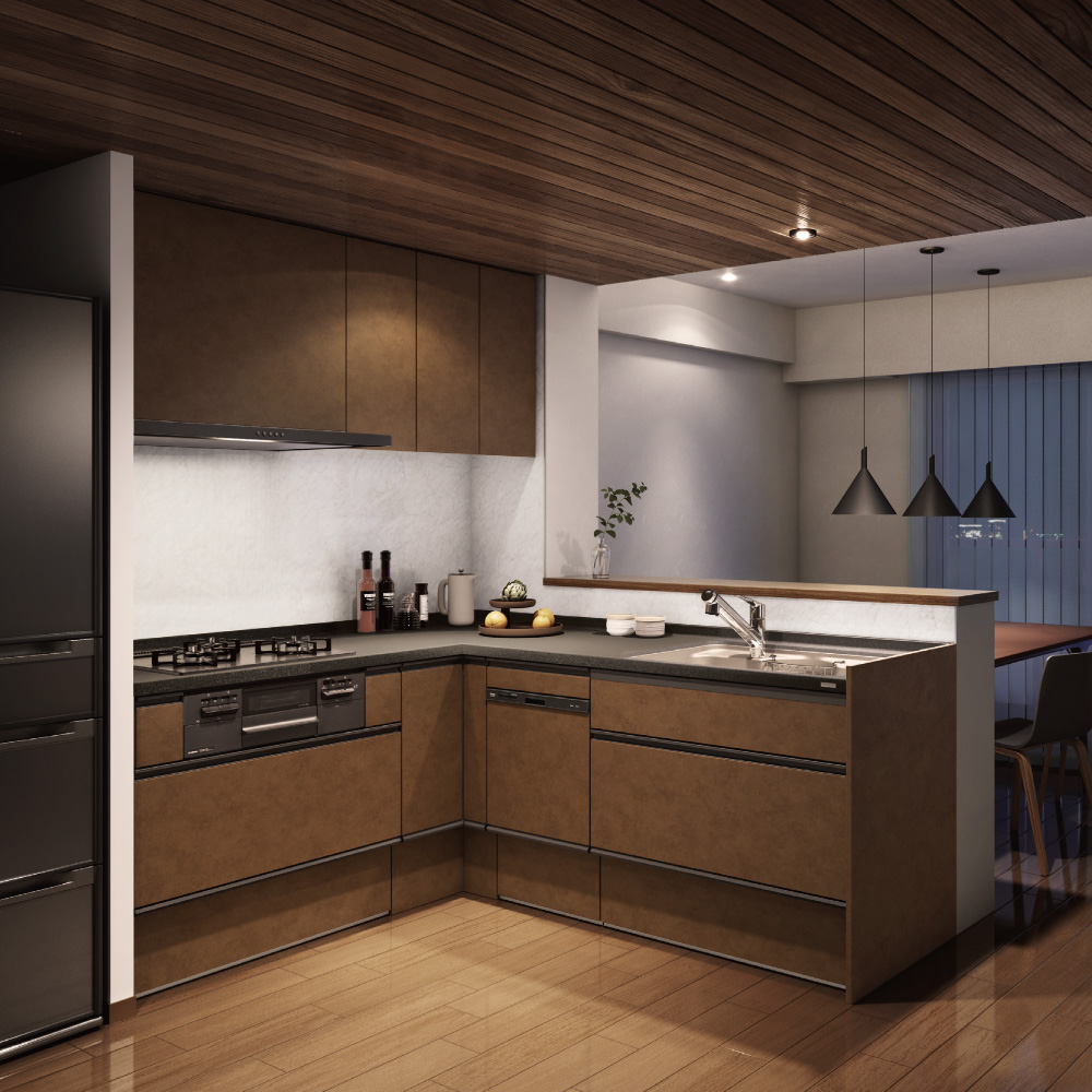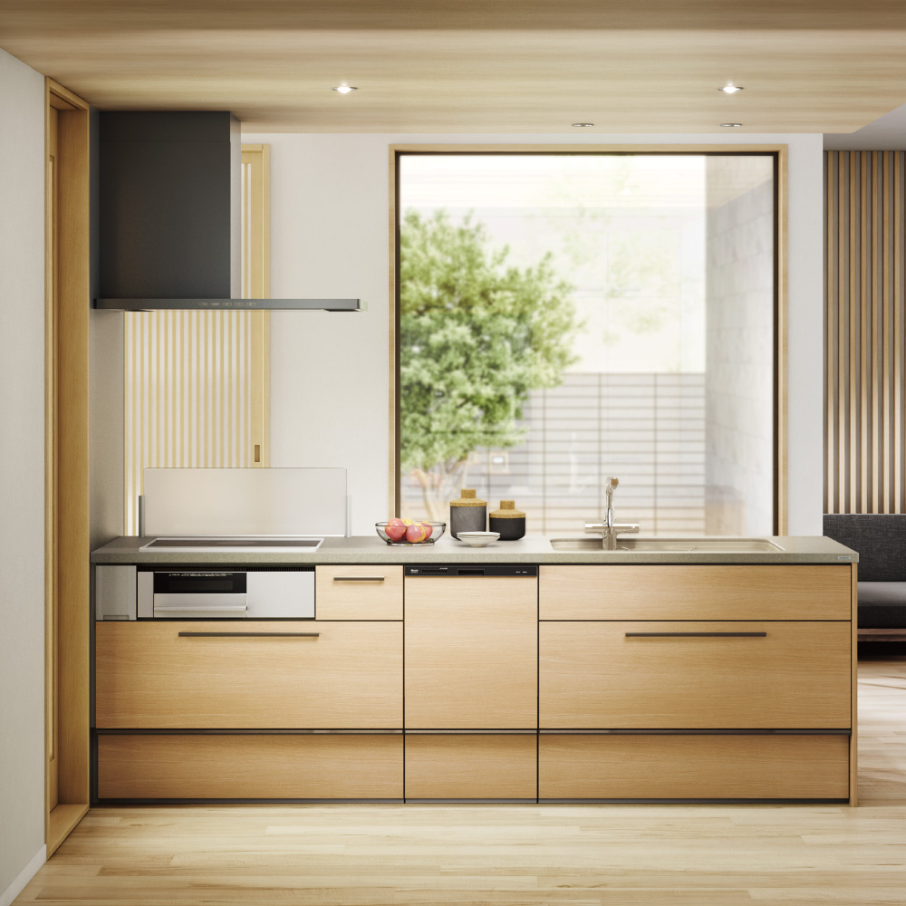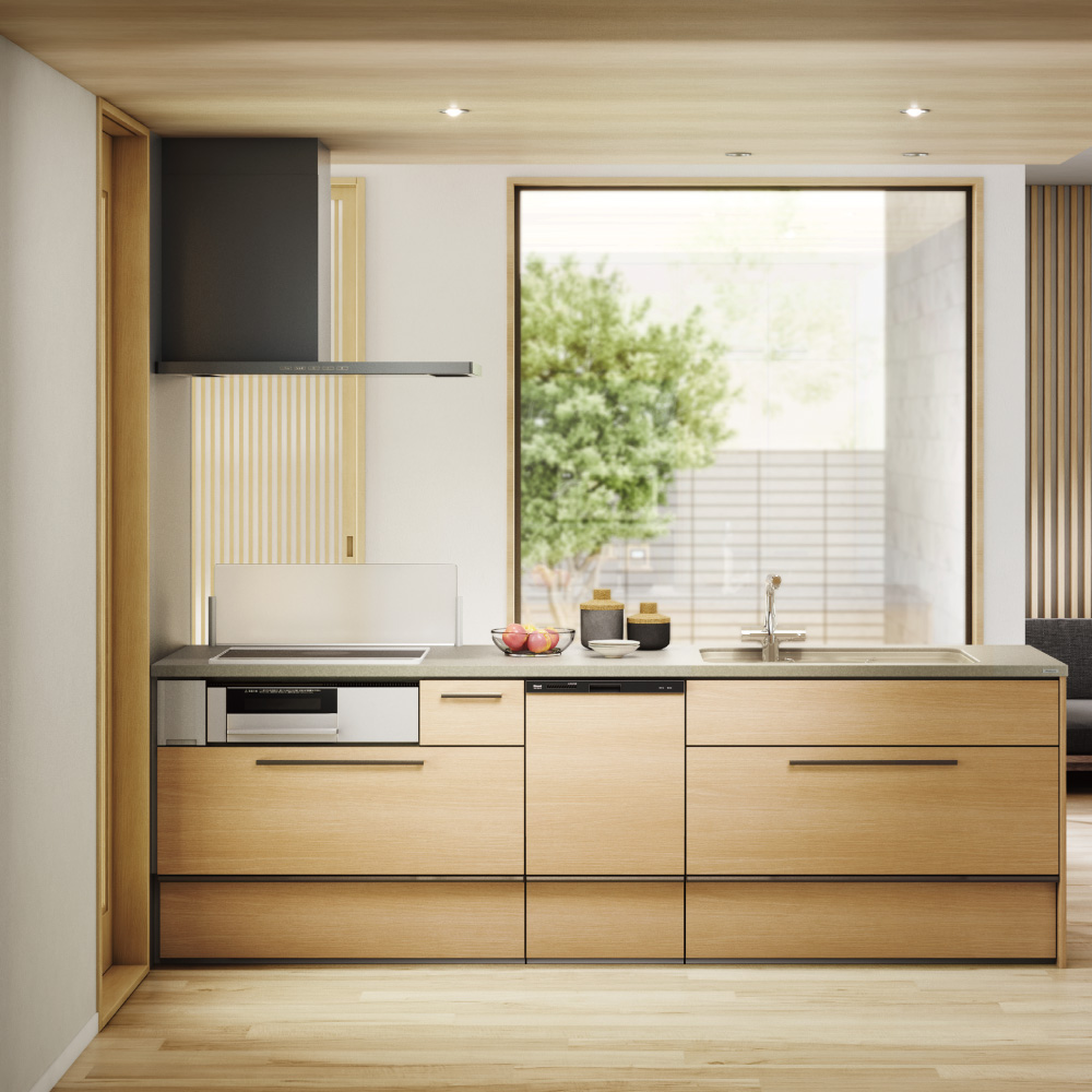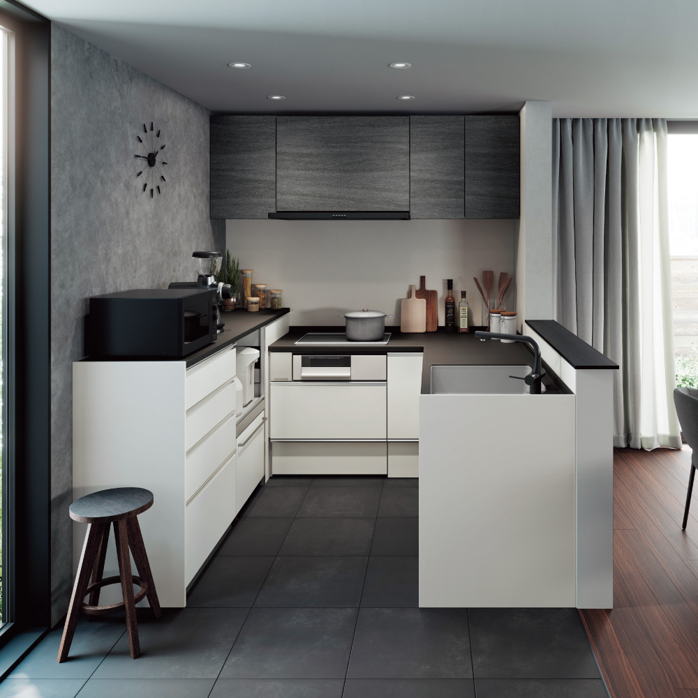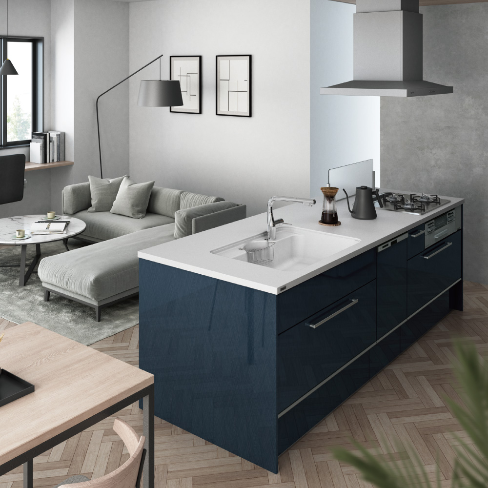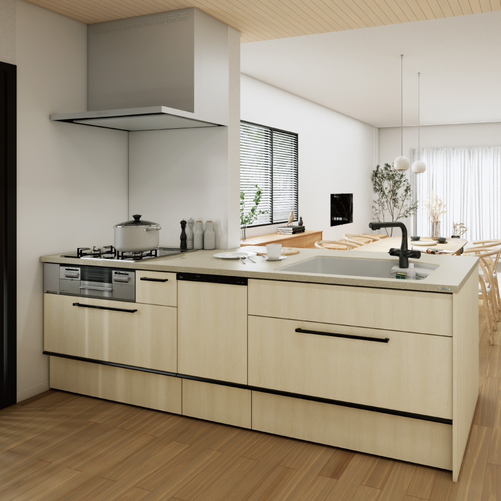 人造大理石のカウンターは、キズがつきにくくお手入れも簡単。美しさと耐久性を兼ね備え、長くご使用いただけます。上質なデザインと機能的な収納が調和した、幅広い空間にフィットするキッチンです。