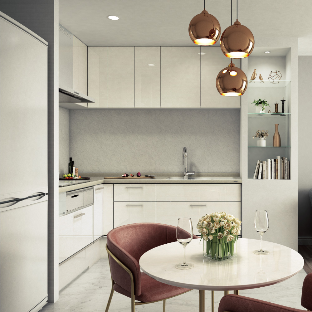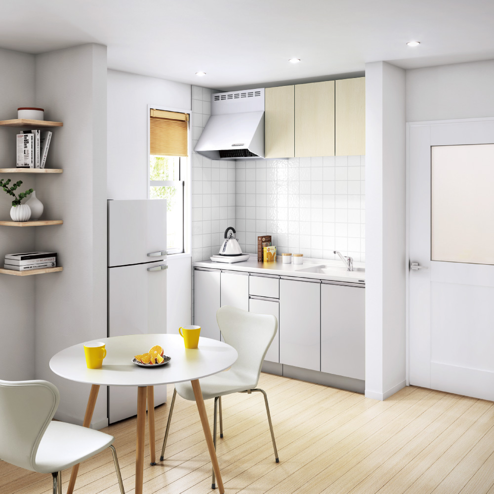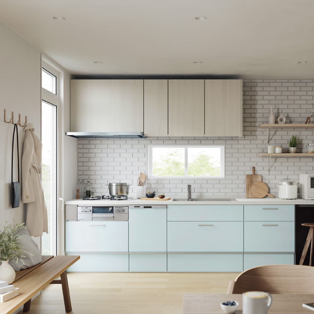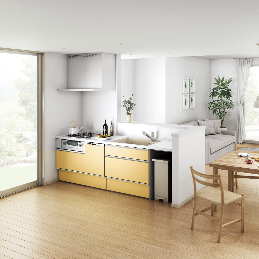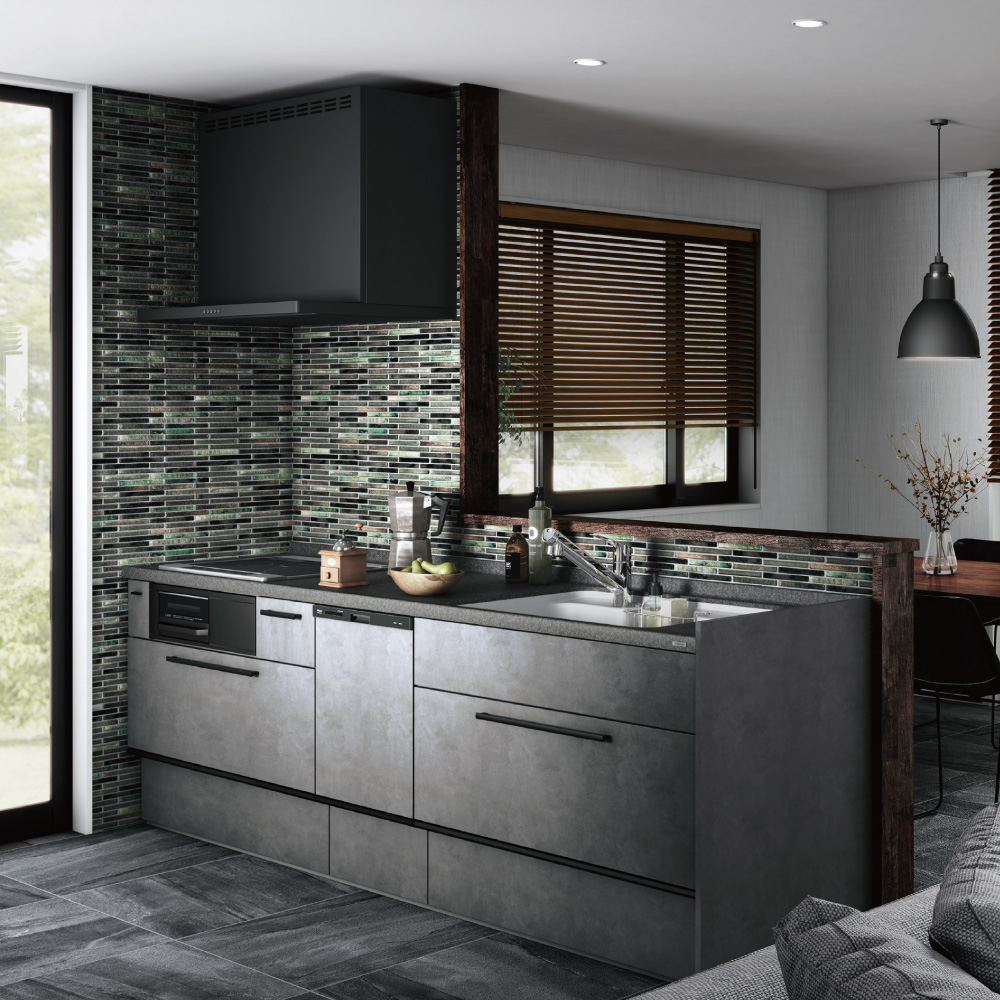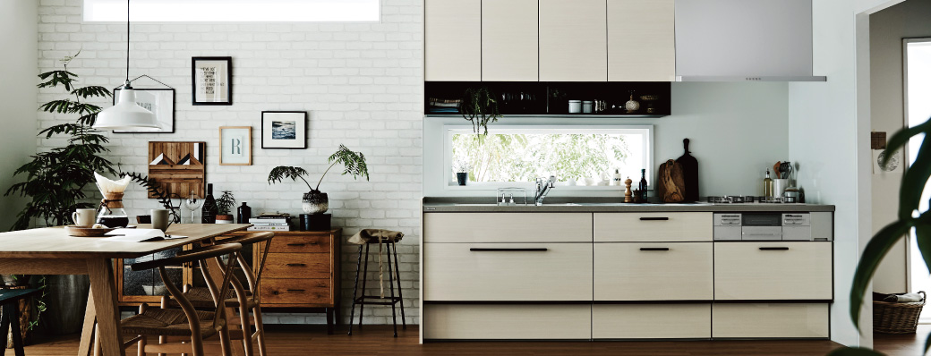 人造大理石のカウンターは、キズがつきにくくお手入れも簡単。美しさと耐久性を兼ね備え、長くご使用いただけます。上質なデザインと機能的な収納が調和した、幅広い空間にフィットするキッチンです。