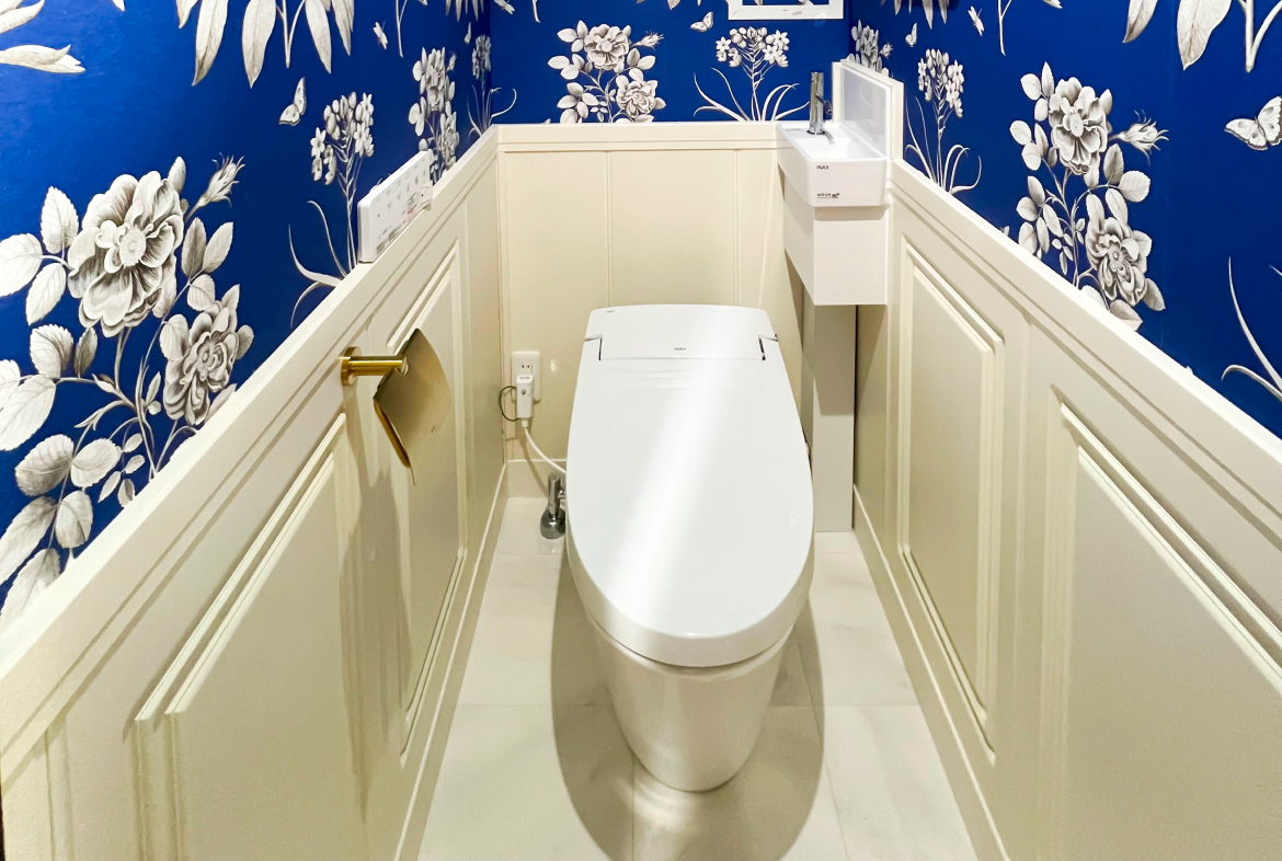 トイレは、壁紙やモールディングなど細部にまでこだわりを詰め込んだ、華やかで特別感のある空間へと生まれ変わりました。壁紙にはお気に入りのデザインを採用し、トイレだからこそ思い切ったコーディネートを実現しています。