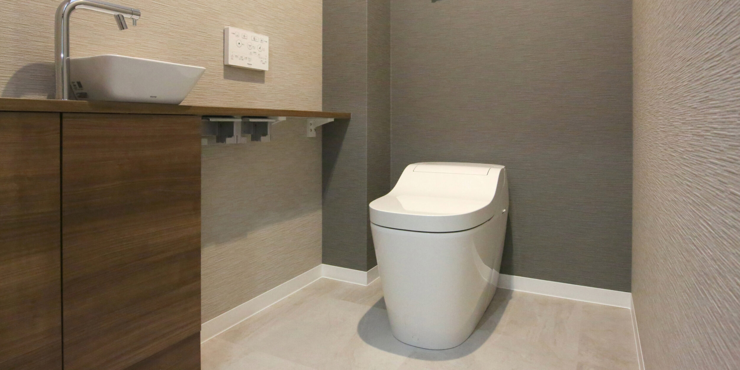 タンク式トイレをLIXILの新発売のタンクレストイレ、サティスXに交換しました。壁紙と床材も交換し、イメージがガラリと変わりました。高級感あふれるマットなデザインと、キレイを維持する機能で、理想の空間を実現しました。